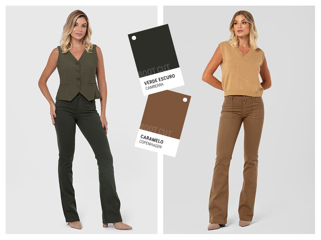 O verde escuro traduz elegância com personalidade. Na modelagem boot cut em sarja cotelê, a Camberra equilibra textura, estrutura e sofisticação. Ideal para quem busca uma cor marcante, mas fácil de harmonizar.