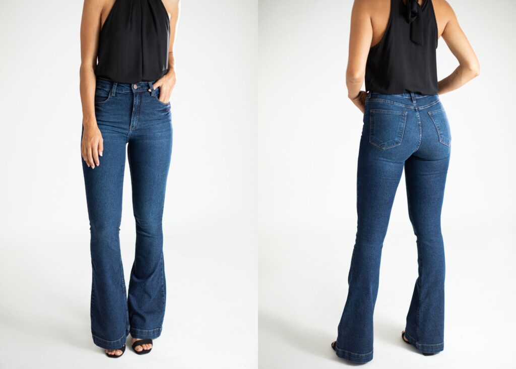 - Jeans flare ou bootcut: os modelos flare ou bootcut são mais justos na cintura e no quadril e têm uma leve abertura nas pernas, o que ajuda a equilibrar a figura e criar uma aparência mais curvilínea.
